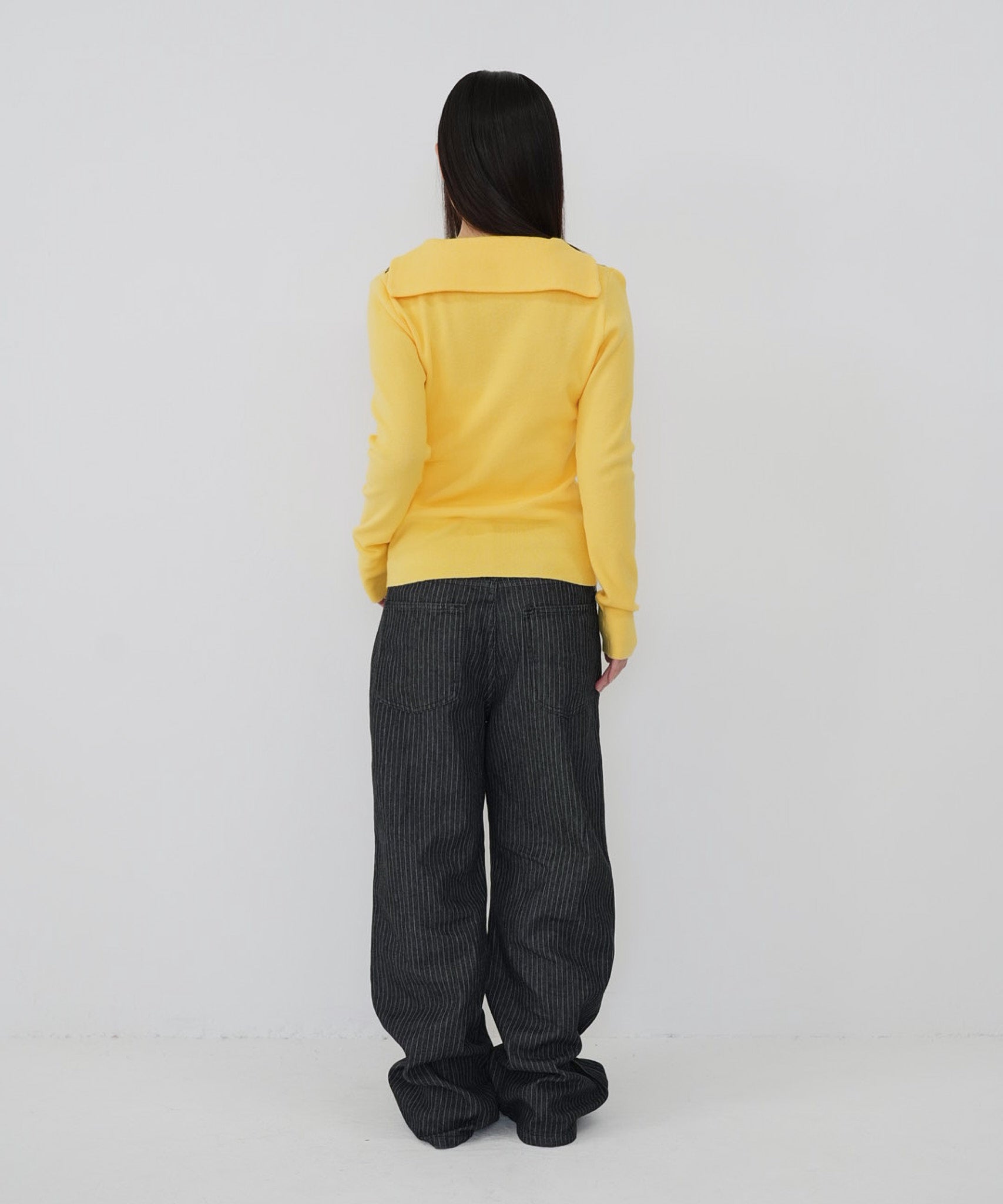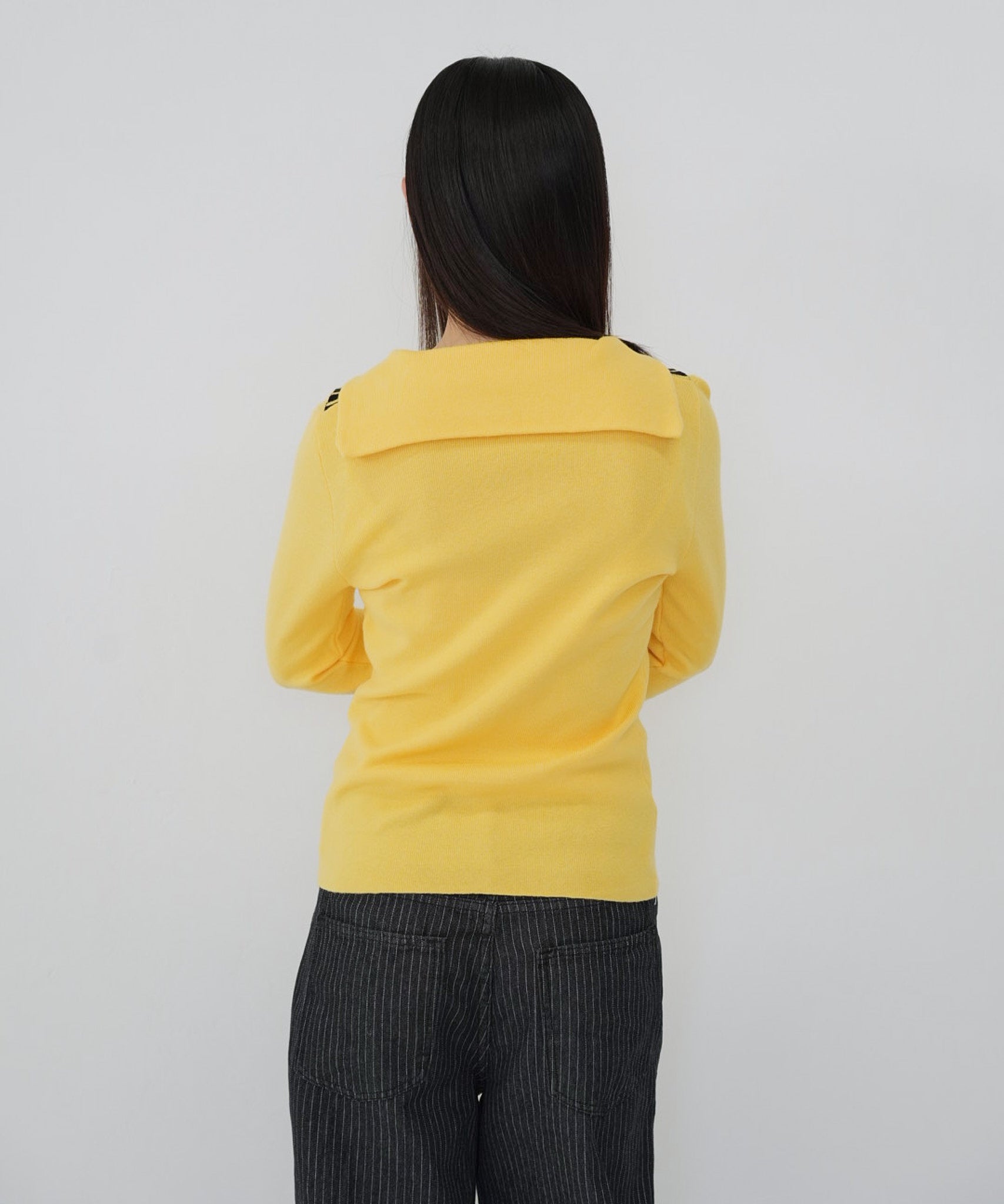 一枚でレイヤード感のあるスタイルが完成するセーラーニット。