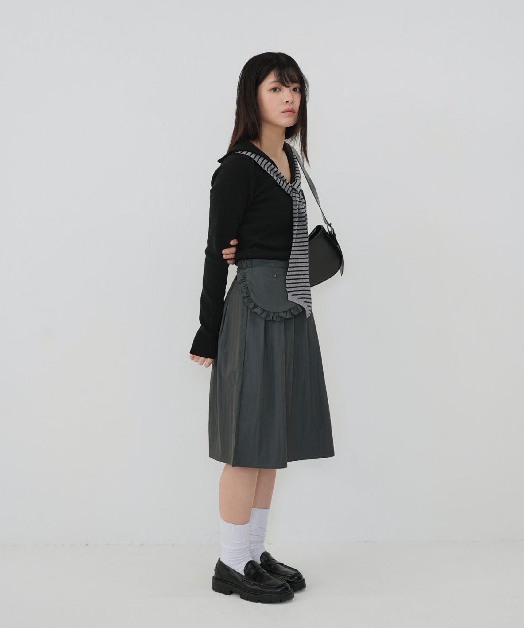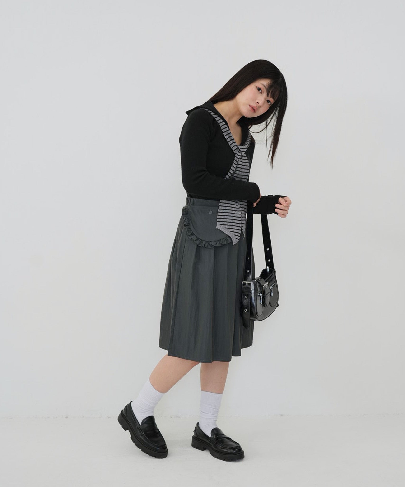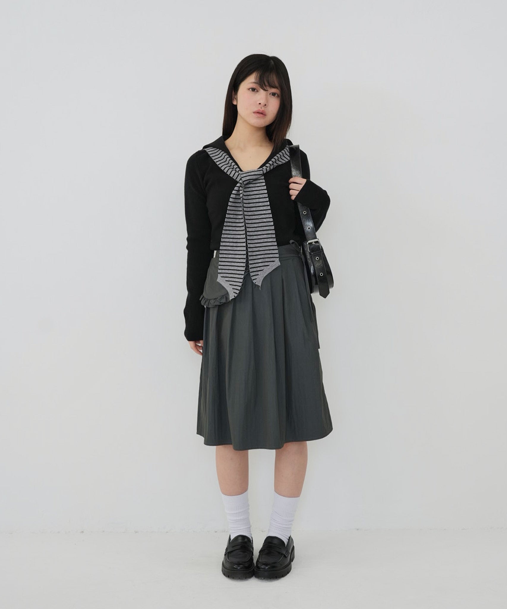 首元にはボーダー柄のスカーフ風デザインをあしらい、